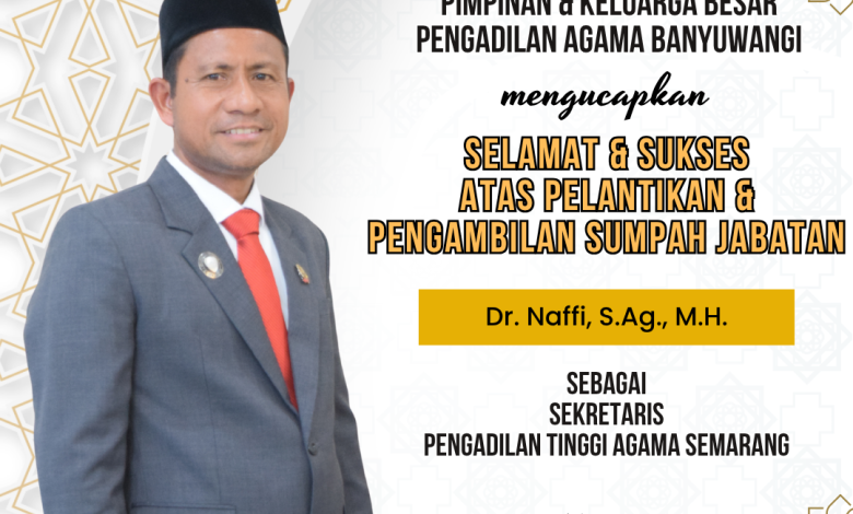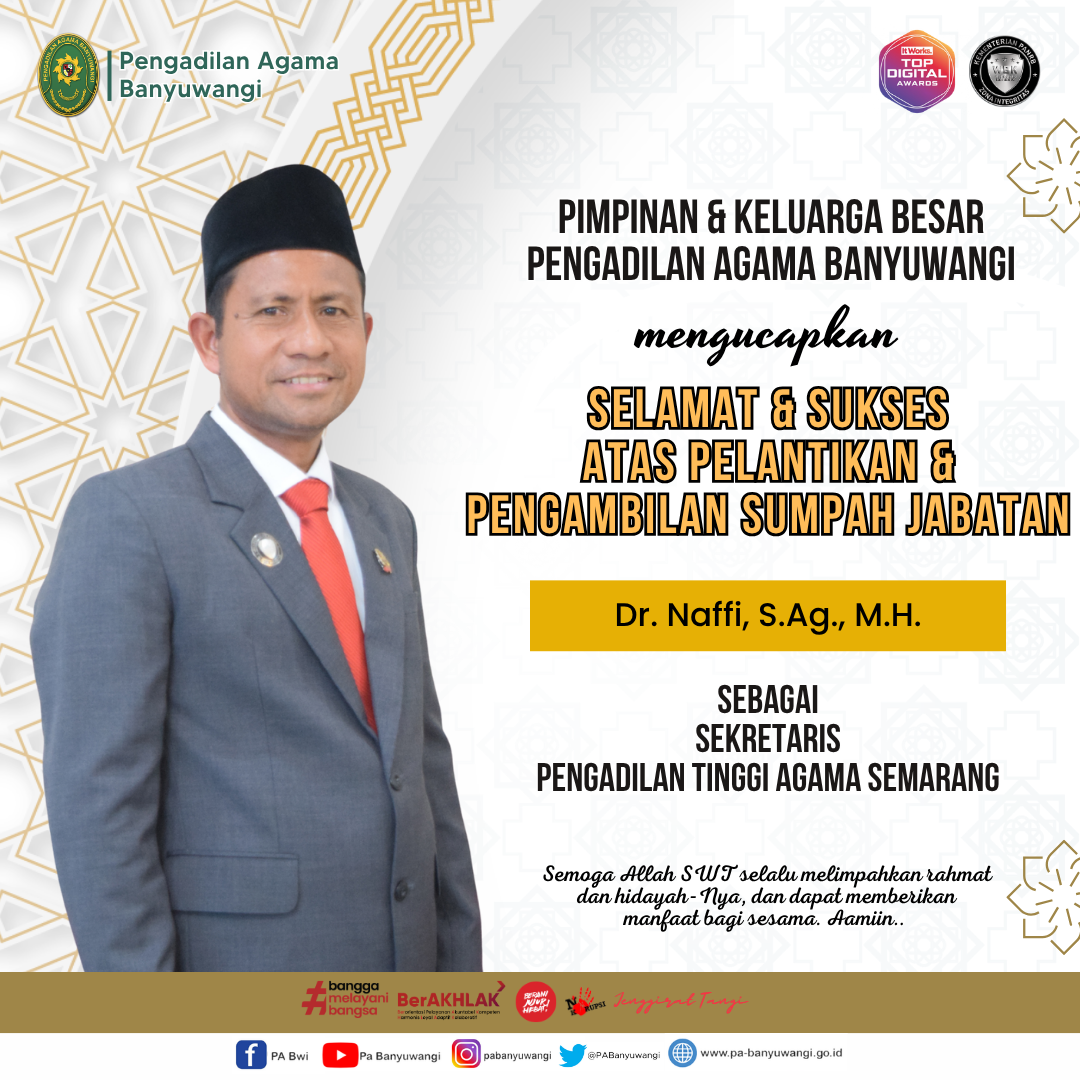Pimpinan dan Keluarga Besar PA Banyuwangi mengucapkan Selamat dan Sukses atas Pelantikan Dr. Naffi, S.Ag., M.H. sebagai Sekretaris PTA Semarang.