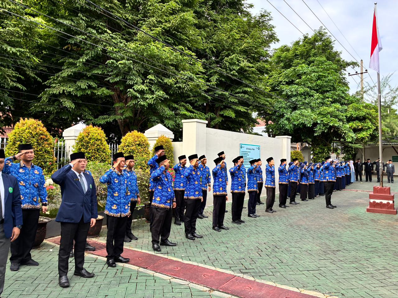 Pengadilan Agama Banyuwangi hari ini menggelar upacara bendera yang khidmat dalam rangka memperingati Hari Pahlawan Nasional, 10 November. Dipimpin langsung oleh Ketua PA Banyuwangi, Bapak Ahmad Rifai, S.Ag., M.H.I., seluruh jajaran berkumpul tepat pukul 07.30 WIB di halaman kantor. Acara ini bukan sekadar rutinitas, melainkan penegasan komitmen PA Banyuwangi untuk menghormati dan meneruskan nilai-nilai luhur perjuangan. Kehadiran seluruh elemen pegawai menunjukkan soliditas institusi dalam menjunjung tinggi nilai kebangsaan.